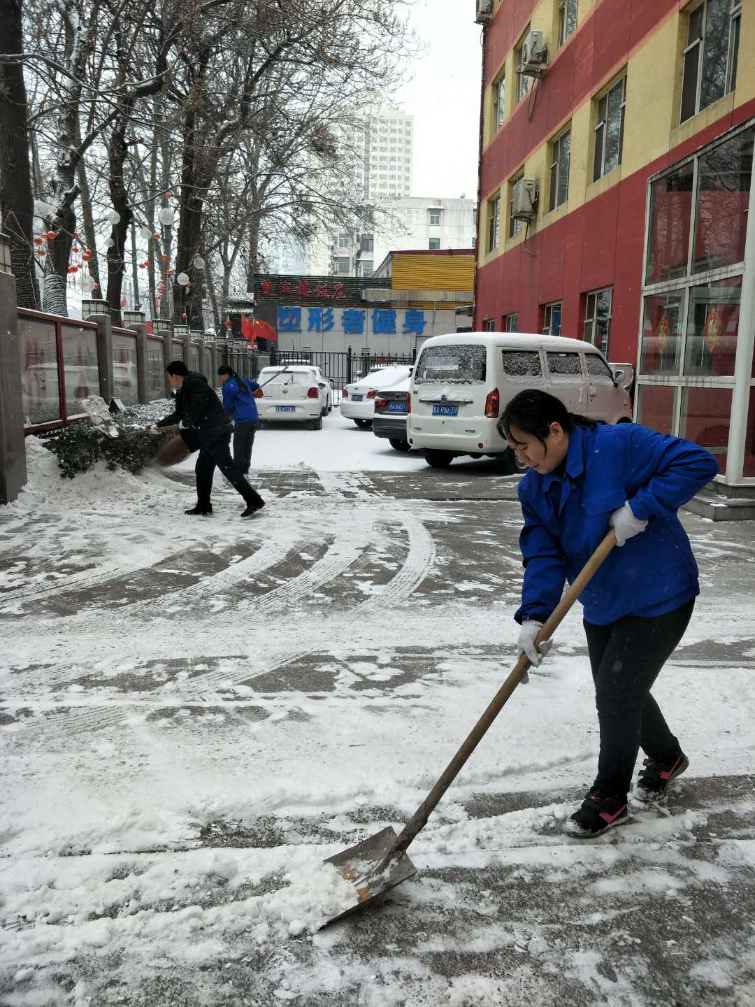 公司管理人員積極組織各項目點員工進(jìn)行主干道路面清雪(左上圖為晉城職業(yè)技術(shù)學(xué)院、右上圖為太原體彩中心)