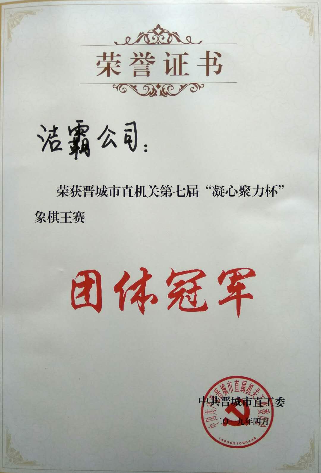 我公司榮獲晉城市直機(jī)關(guān)第七屆“凝心聚力杯”象棋王賽團(tuán)體冠軍