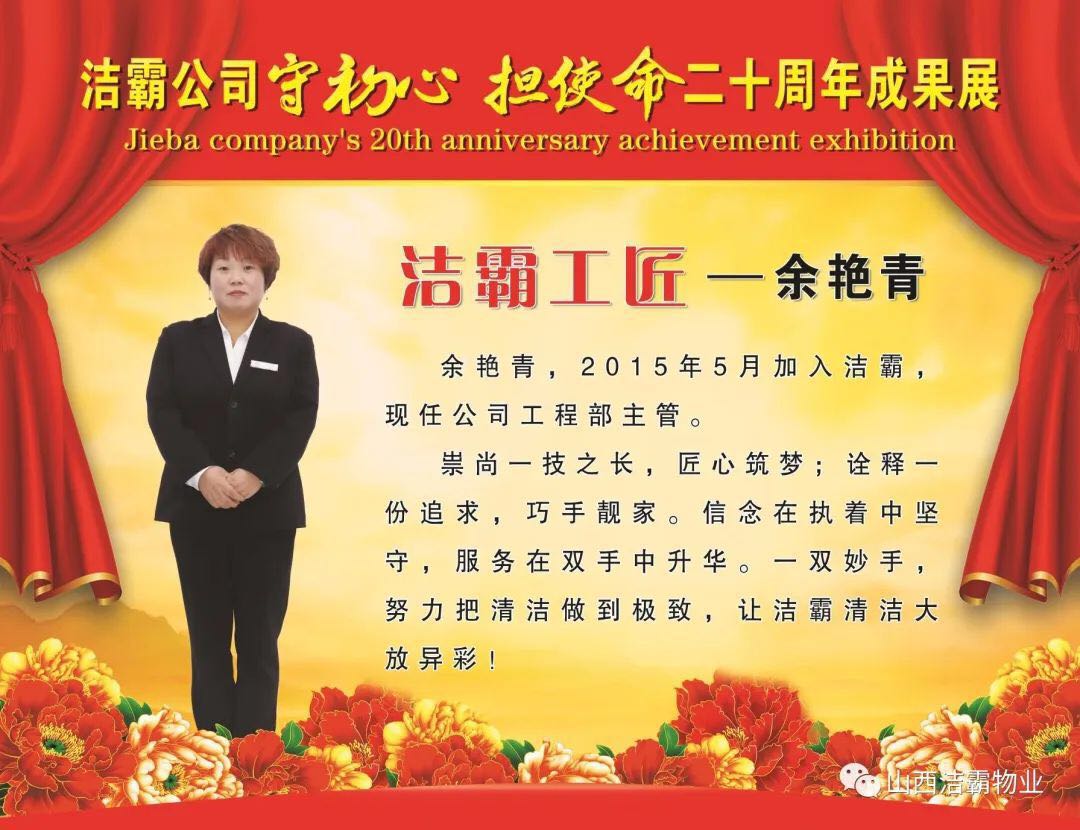 余艷青同志自2015年進入潔霸以來,一直奮斗在工程部的第一線從事主管工作。工作中,余艷青同志愛崗敬業(yè),遵守職業(yè)道德,為人誠實守信;她熱愛工作,對待客戶熱情周到、耐心細致;工作中團結同事,責任心強,吃苦耐勞,服從大局,以公司的利益為重。在我市開展的“三洗六見一紅旗”活動和全國文明城市的創(chuàng)建活動中,她帶領員工高標準、高質量、高效率地完成清洗美化工作,為扮靚晉城形象,打造城市優(yōu)美環(huán)境做出了突出貢獻。先后多次被公司評為優(yōu)秀員工等,2019年在公司成立20周年慶之際,她又被公司授予“潔霸工匠”稱號。