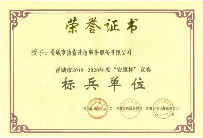 日前,2019----2020年度全市“安康杯”競(jìng)賽活動(dòng)中,晉城市潔霸清潔服務(wù)股份有限公司被晉城市總工會(huì)、晉城市應(yīng)急管理局、晉城市衛(wèi)生健康委員會(huì)聯(lián)合授予“安康杯”競(jìng)賽“標(biāo)兵單位”。