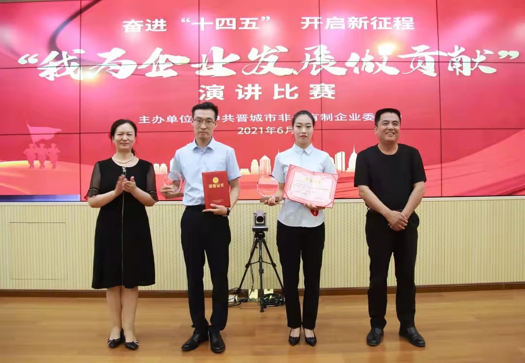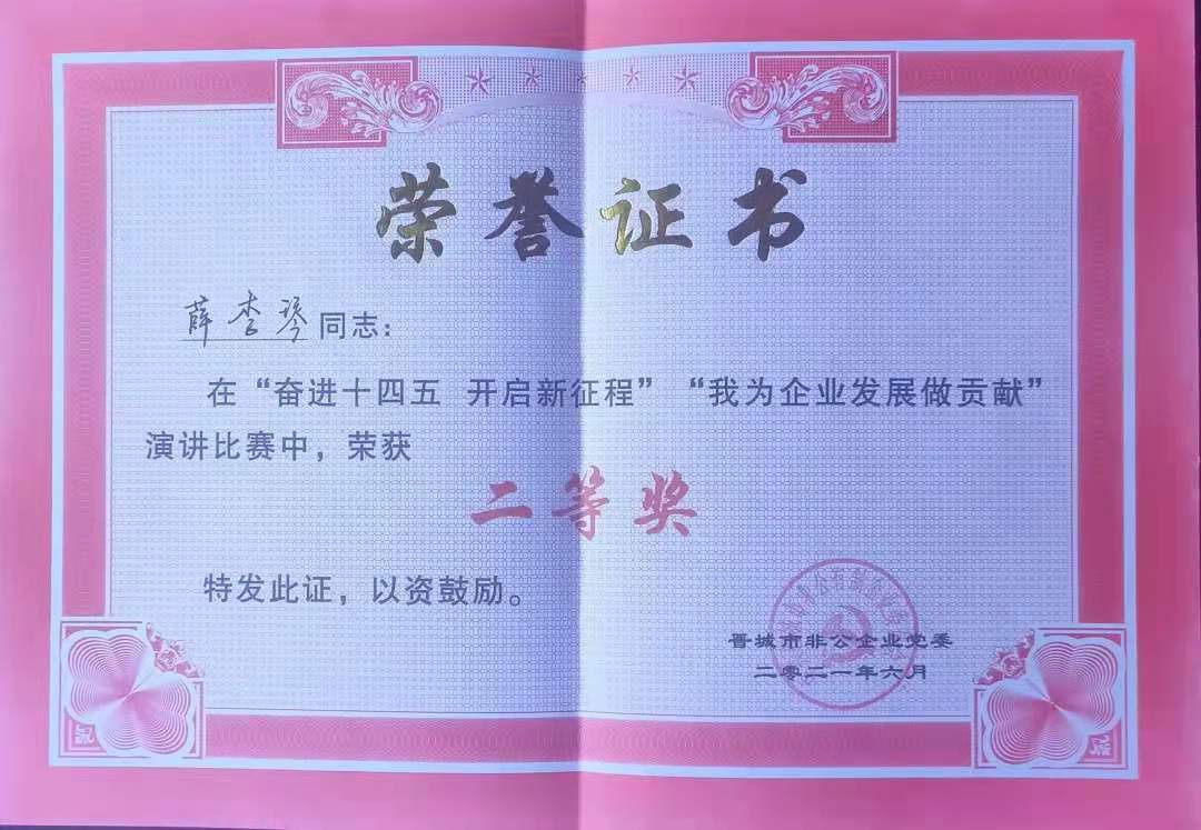 62日下午,晉城市非公企業(yè)黨委奮進十四五·開啟新征程 我為企業(yè)發(fā)展做貢獻主題演講比賽決賽在市市場監(jiān)督管理局6樓視頻會議室成功舉行。我公司選手薛李琴在決賽中榮獲二等獎。