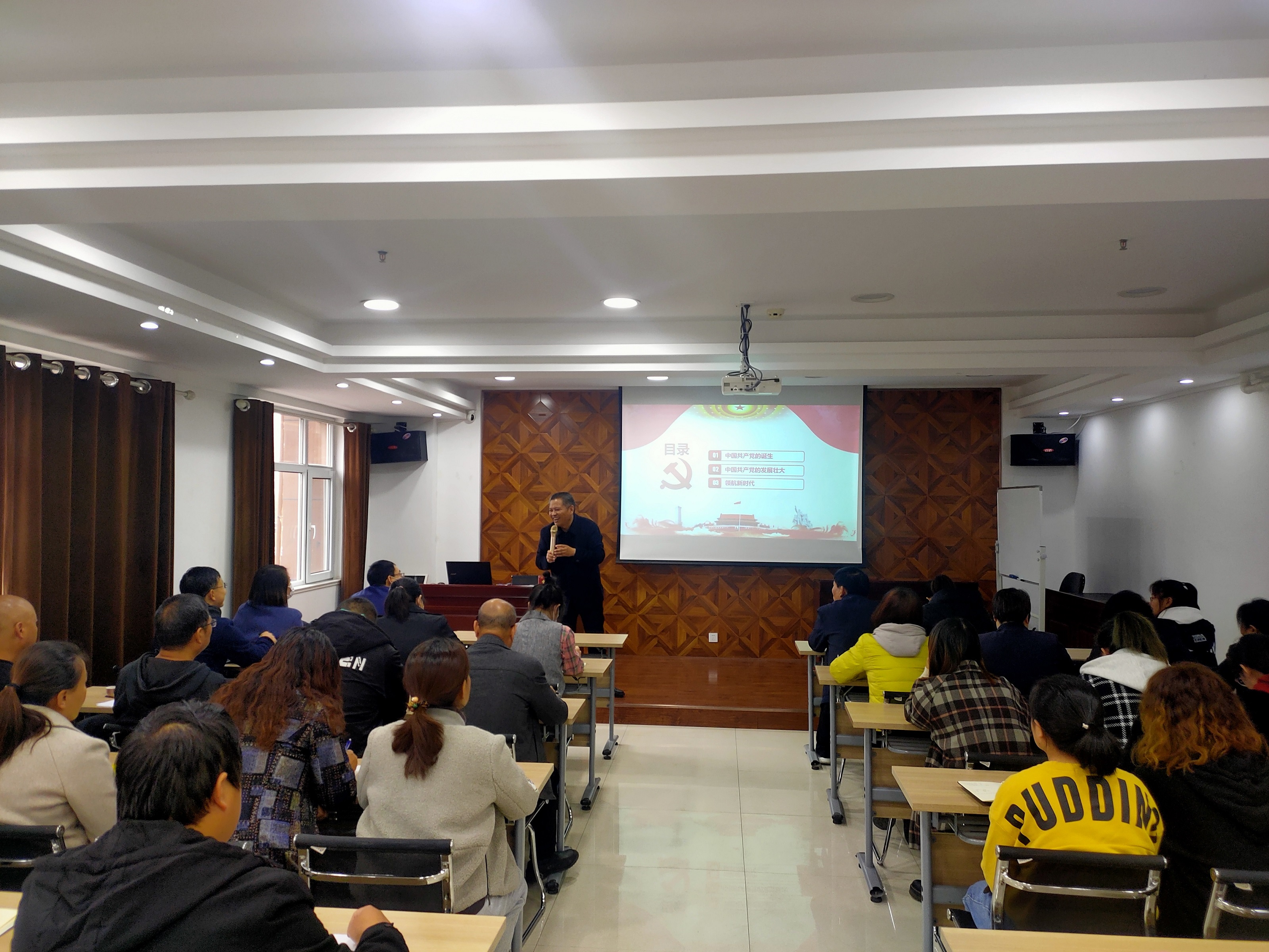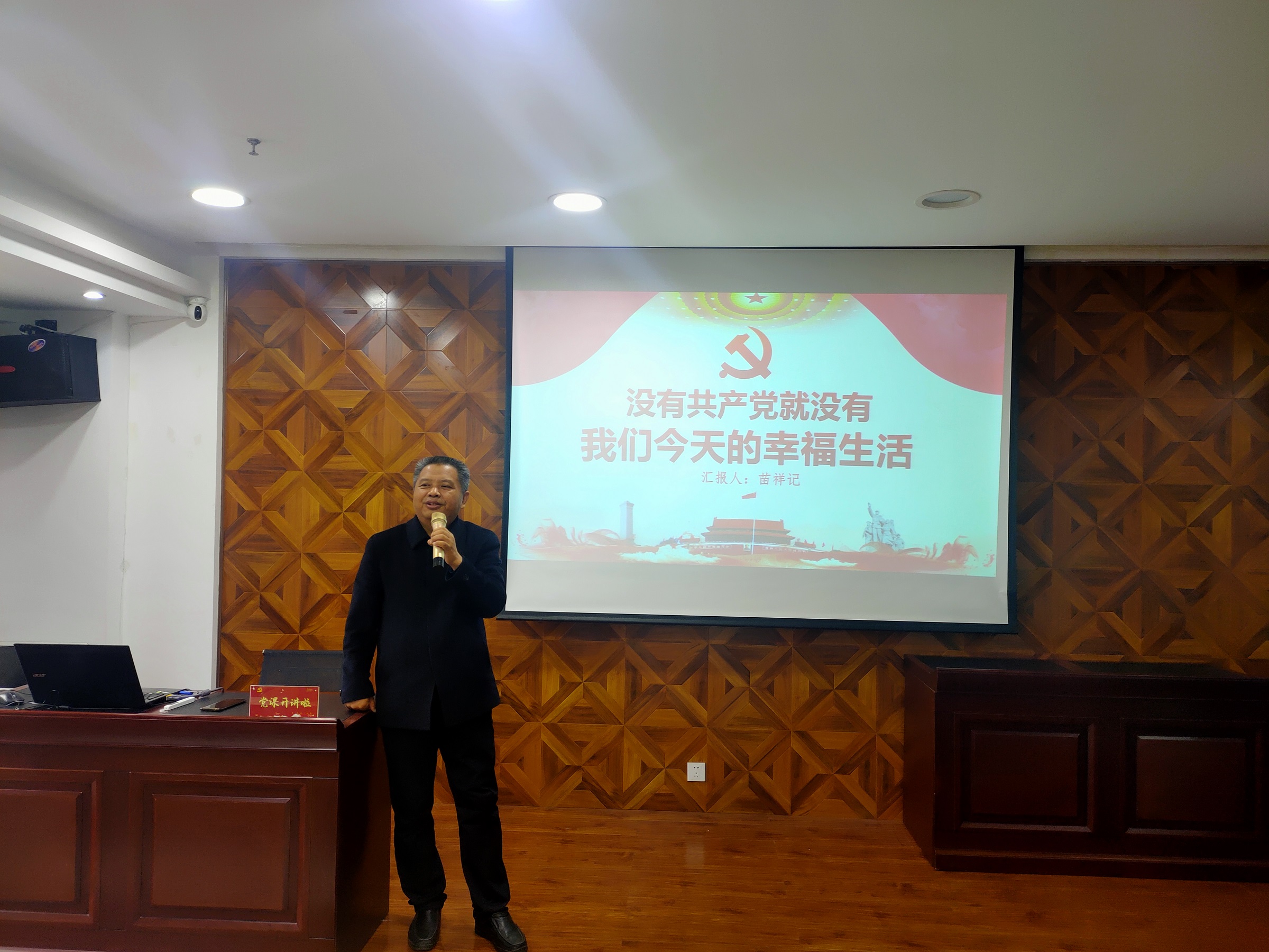 黨課中,苗祥記校長(zhǎng)以“沒有共產(chǎn)黨就沒有我們今天的幸福生活”為主題,從1901年清政府簽訂喪權(quán)辱國(guó)的《辛丑條約》講起,引用大量翔實(shí)、生動(dòng)的歷史資料,對(duì)“十月革命”、中國(guó)共產(chǎn)黨的誕生、創(chuàng)建井岡山革命根據(jù)地、遵義會(huì)議、中共中央在延安、中共七大、中共建設(shè)社會(huì)主義的偉大成就等歷史場(chǎng)景為大家作了系統(tǒng)全面的講解,全景式展現(xiàn)了中國(guó)共產(chǎn)黨的誕生、歷經(jīng)淬煉而逐步發(fā)展、成熟、壯大以及領(lǐng)航新時(shí)代的的偉大歷程,闡述了中國(guó)共產(chǎn)黨的初心、使命和宗旨,讓與會(huì)人員更直觀更深刻認(rèn)識(shí)到?jīng)]有共產(chǎn)黨就沒有我們今天的幸福生活,經(jīng)受了一次深刻的紅色文化洗禮。