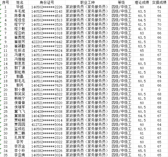 晉城市潔霸清潔服務(wù)股份有限公司職業(yè)技能等級(jí)認(rèn)定中心2024年1月14日第1批家政服務(wù)員中級(jí)認(rèn)定人員成績(jī)公示