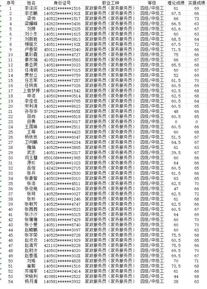 晉城市潔霸清潔服務(wù)股份有限公司職業(yè)技能等級(jí)認(rèn)定中心2024年1月21日上午第3批家政服務(wù)員中級(jí)認(rèn)定人員成績(jī)公示