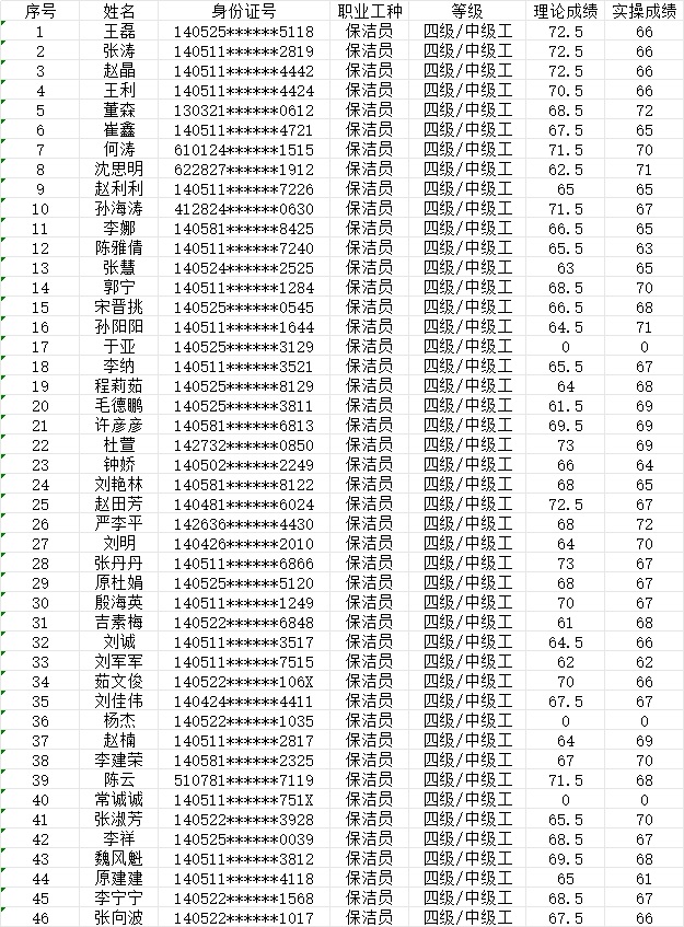 晉城市潔霸清潔服務(wù)股份有限公司職業(yè)技能等級(jí)認(rèn)定中心2024年1月21日下午第4批保潔員中級(jí)認(rèn)定人員成績(jī)公示