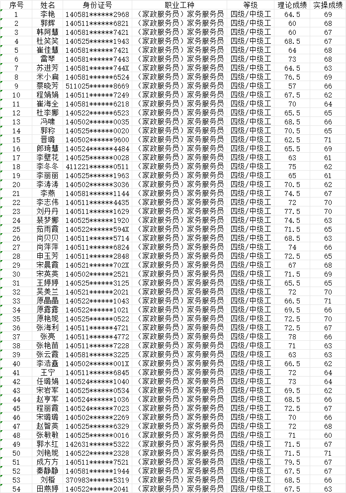 晉城市潔霸清潔服務股份有限公司職業(yè)技能等級認定中心2024年1月27日上午第5批家政服務員中級認定人員成績公示