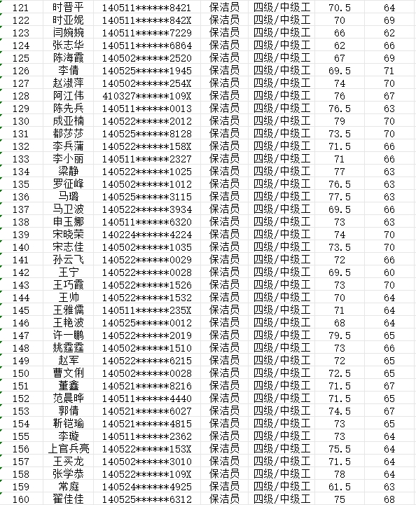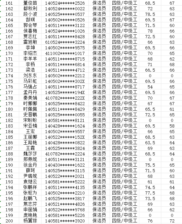 晉城市潔霸清潔服務(wù)股份有限公司職業(yè)技能等級認(rèn)定中心現(xiàn)將2024年2月25日認(rèn)定人員成績公示如下: