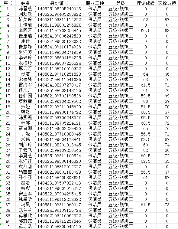 晉城市潔霸清潔服務(wù)股份有限公司職業(yè)技能等級認(rèn)定中心現(xiàn)將202484日認(rèn)定人員成績公示如下: