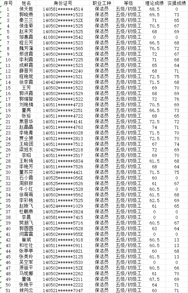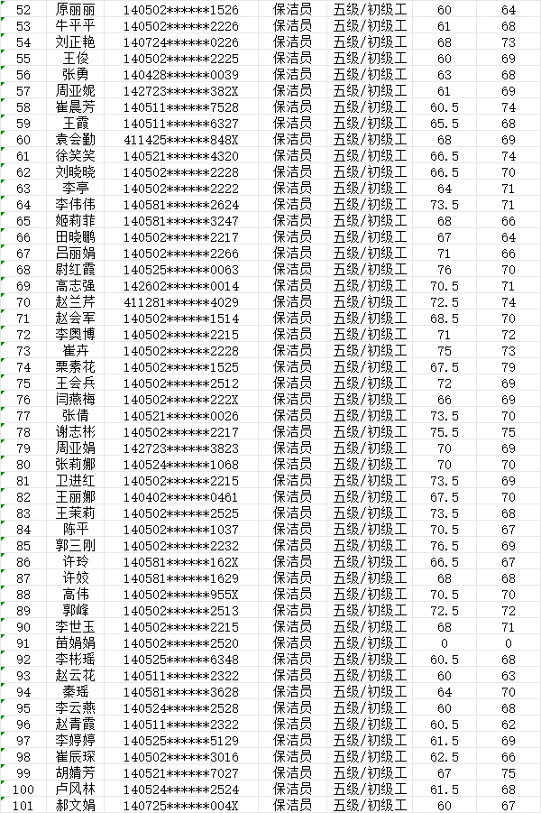 晉城市潔霸清潔服務(wù)股份有限公司職業(yè)技能等級(jí)認(rèn)定中心2024年7月28日第26批保潔員初級(jí)認(rèn)定人員成績(jī)公示
