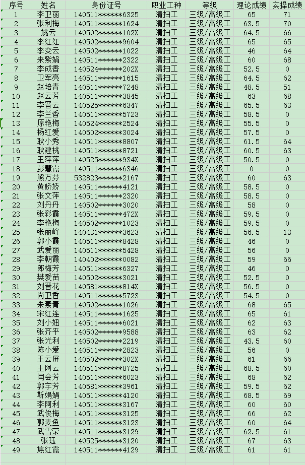 晉城市潔霸清潔服務(wù)股份有限公司職業(yè)技能等級認(rèn)定中心2024年8月3日第8批保潔員高級認(rèn)定人員成績公示