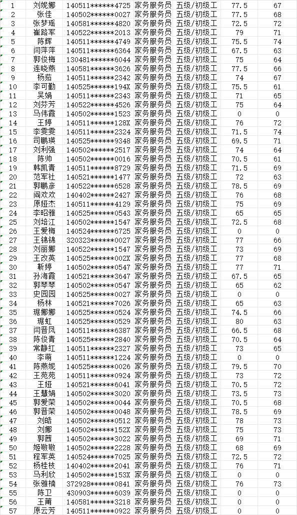 晉城市潔霸清潔服務(wù)股份有限公司職業(yè)技能等級(jí)認(rèn)定中心2024年9月21日第39批家政服務(wù)員初級(jí)認(rèn)定人員成績(jī)公示